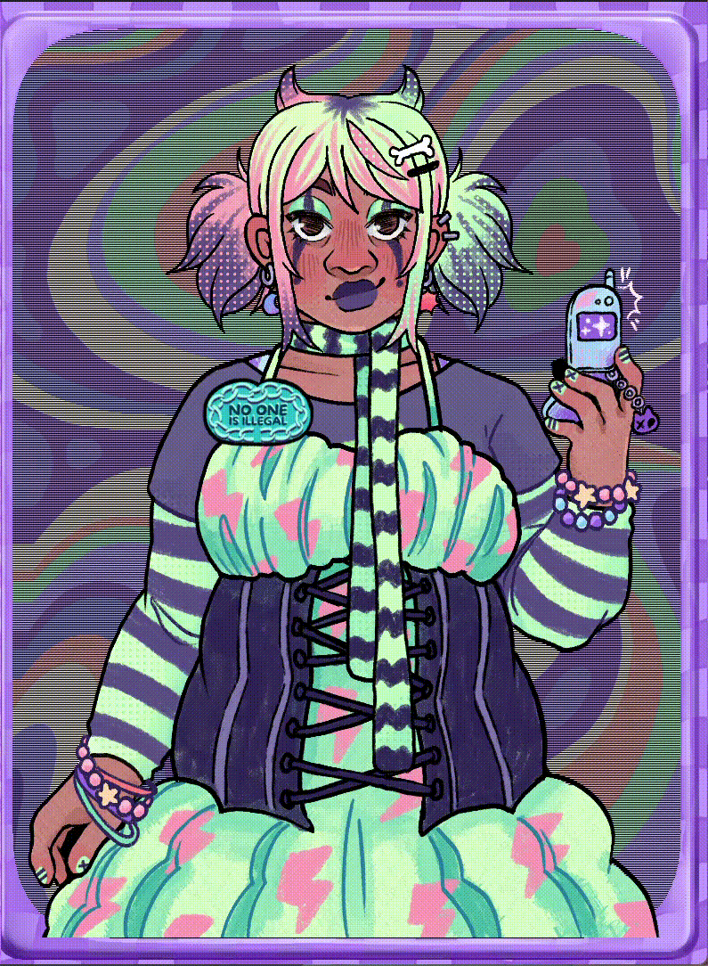 I created a series of Y2K-themed backgrounds to compliment AstralLamb's artwork. We made use of a unified colour palette and a shared library of Clip Studio Paint brushes to maintain a cohesive overall look throughout our 10-day development timeline.Together, we committed to the vibrant colours and bold patterns of maximalist punk.
